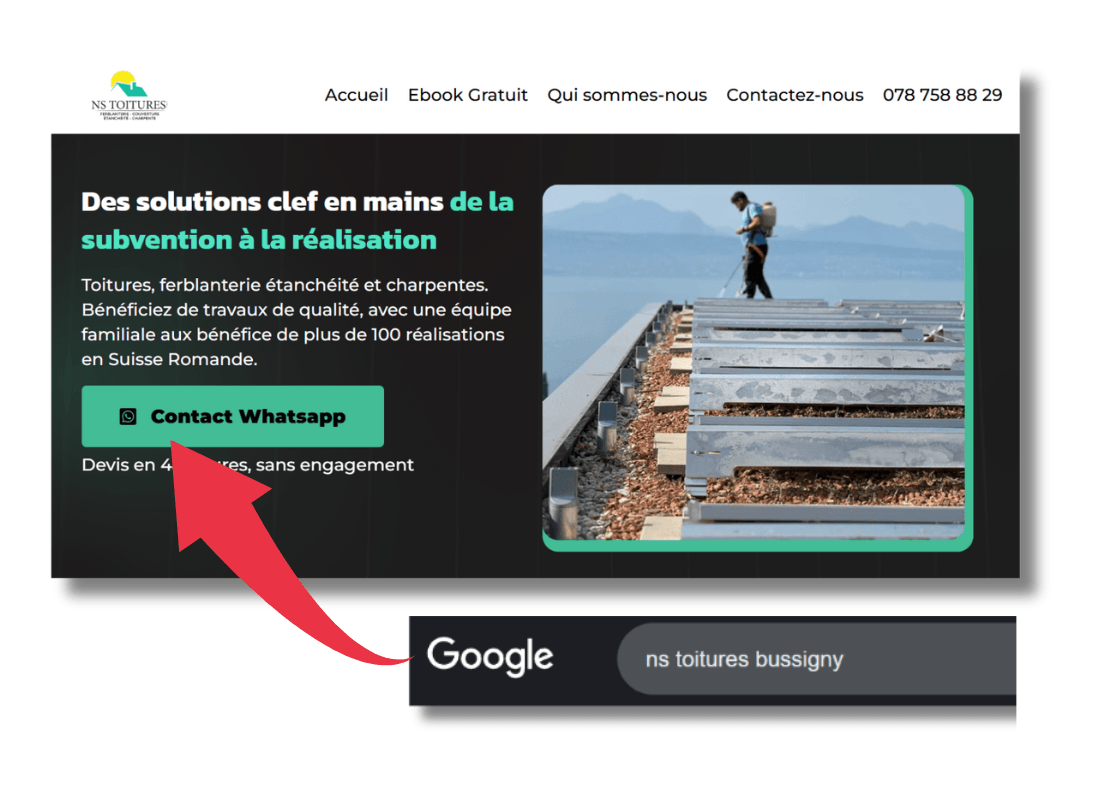 Qui montre directement, de quoi le client va bénéficier en vous confiant son projet, avec un contact whats app pour vous appeler.
