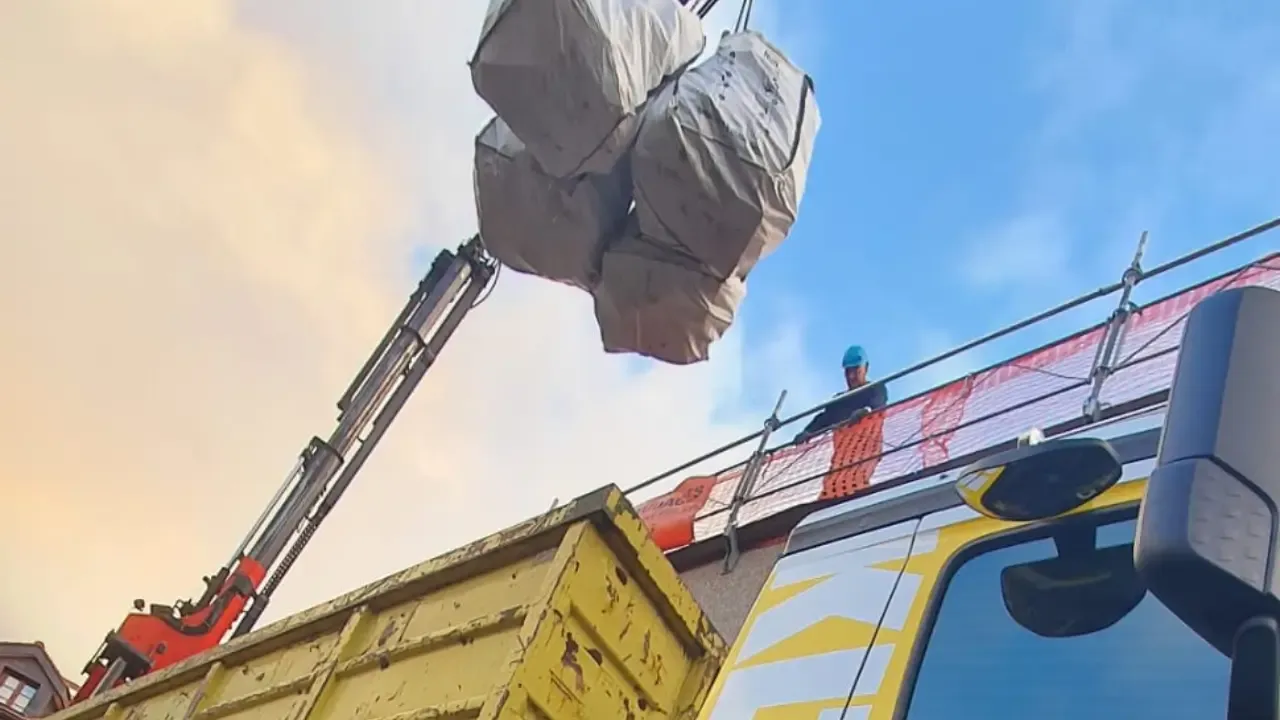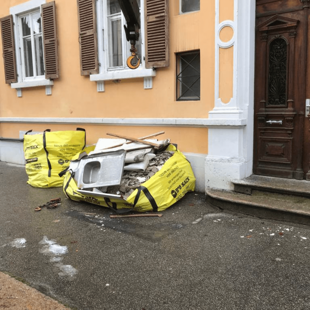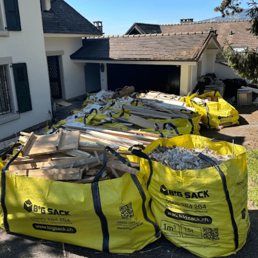Les sacs 1 et 2m3 pour la tuile et les gros pour l'isolation et la sous construction. Disposés quasiment à côté des ouvriers.