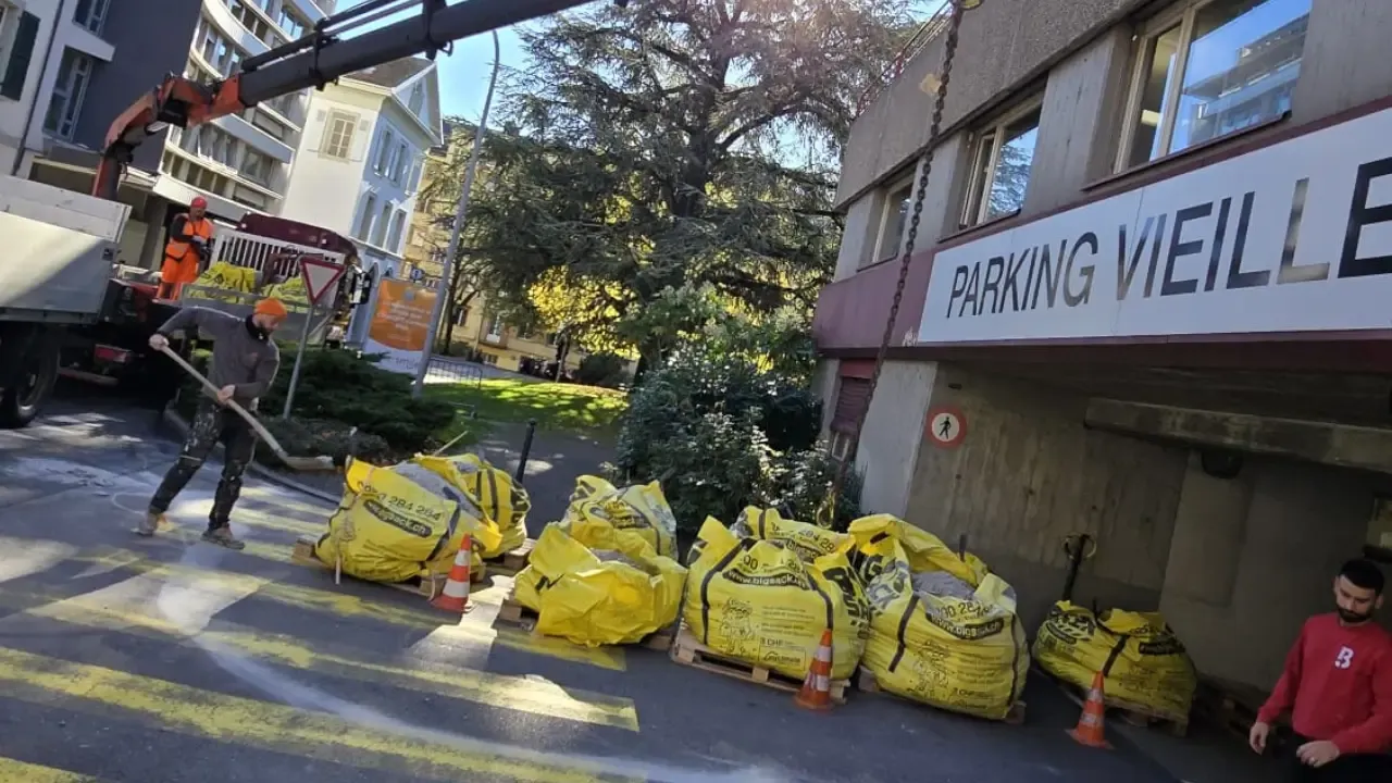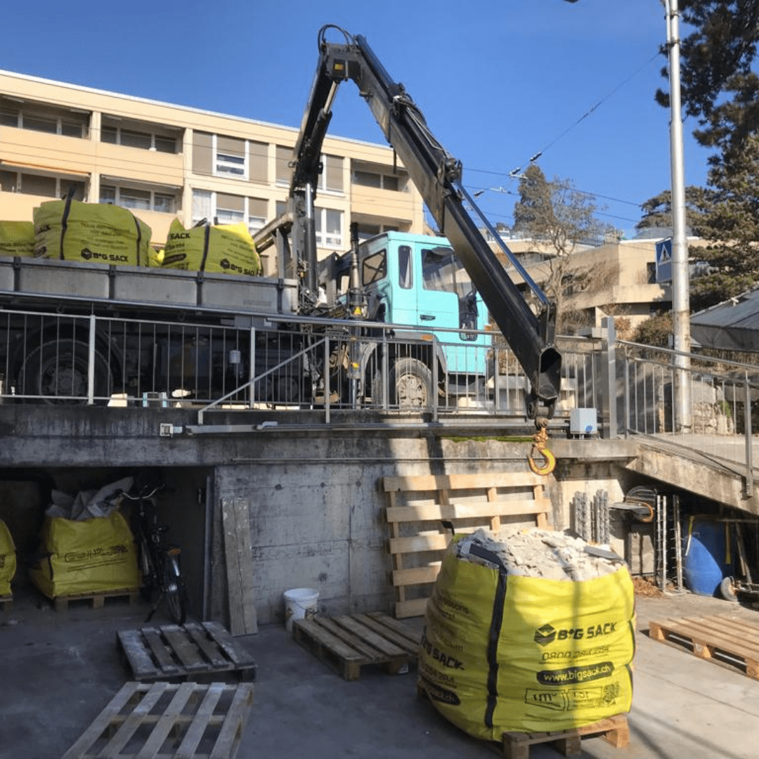 Les sacs 1 m³ sont déplacés sur palette pour couvrir la surface du chantier, sans gêner la circulation.