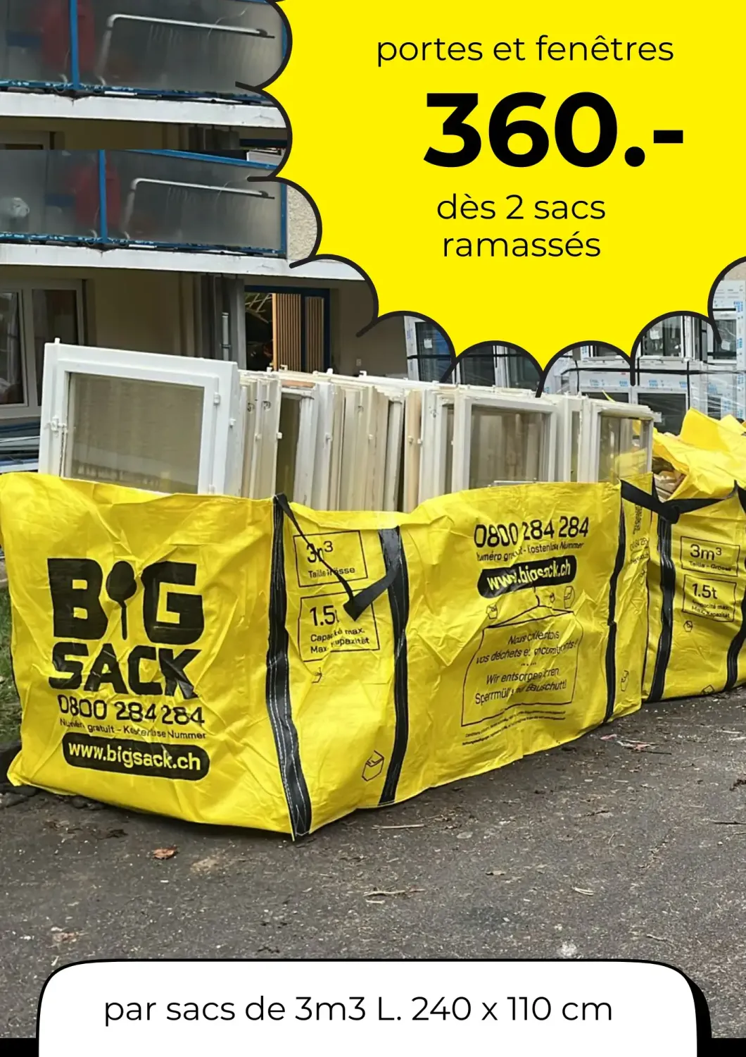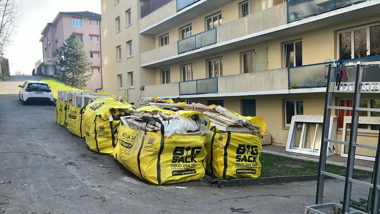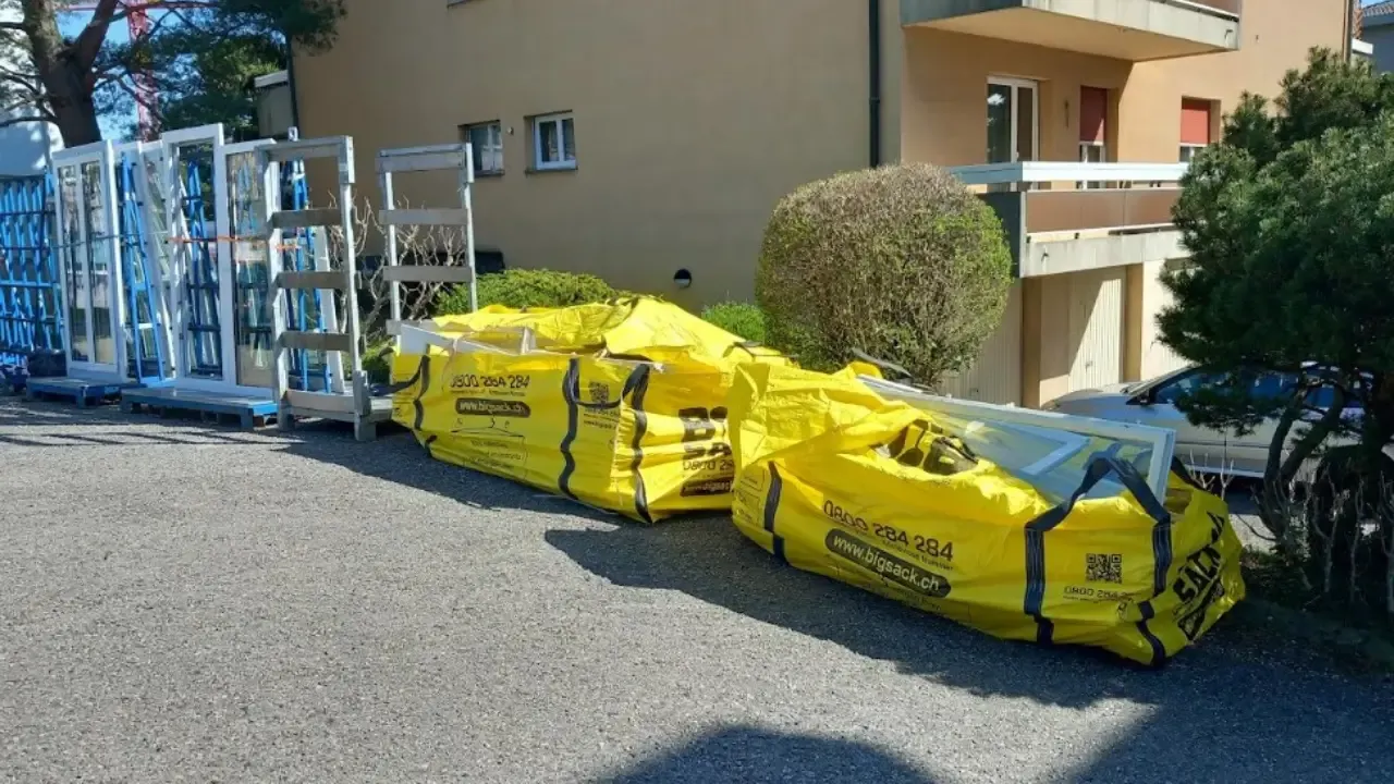 On glisse les menuiseries dans les 3 m³, souvent disposés vers l'entrée, où les bennes ne passent pas.