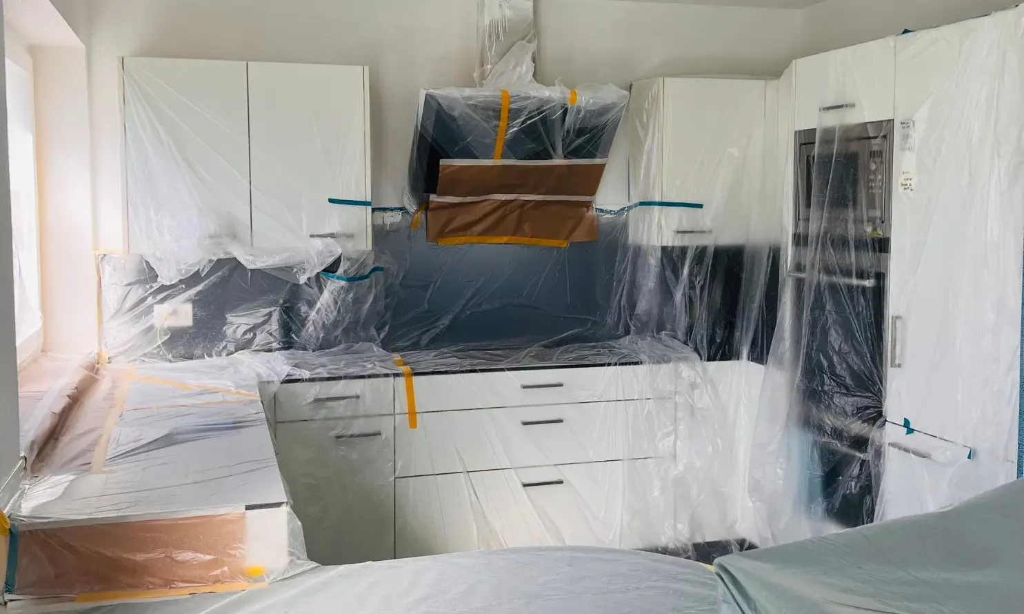 Projet de rénovation peinture réalisé dans un appartement habité à Ollon, comprenant la protection complète de la cuisine, du mobilier et des surfaces sensibles avant mise en peinture.